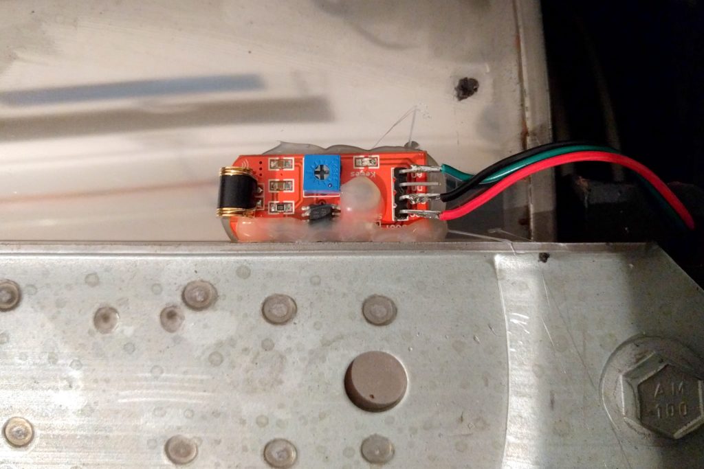 Es gibt sicher noch mehr Möglichkeiten, ich habe mich für die letzt genannte entschieden, den Vibrations-Sensor. Die Idee war also, mit diesem Sensor ein zeitliches Profil der Vibrationen der Waschmaschine zu messen, die beim Schleudern entstehen. Und kurz nach dem letzten Schleudern sollte die Maschine dann fertig sein und die Benachrichtigung kann abgesetzt werden. Soweit die Idee. Ich hab also den Vibrationssensor außen an das Gehäuse der Waschmaschine geklebt und angefangen, damit Vibrationen zu messen, und zwar für alle drei Raumrichtungen. Leider hat sich nach Auswertung der Profile einiger Waschgänge herausgestellt, dass die Schwingungsdämpfung der Waschmaschine zu gut ist, um die Schleudergänge eindeutig zu identifieren. Gut für die Maschine, schlecht für die ihr zugedachte Smartheit. Daher wurde der Sensor im zweiten Anlauf mit Heißkleber innen in der Maschine angebracht, direkt an der (ungedämpften) Trommel. Danach wurden die drei Kabel für Ground, +5V und Data nach außen gelegt und der D1 mini mit Klebeband am Gehäuse befestigt: