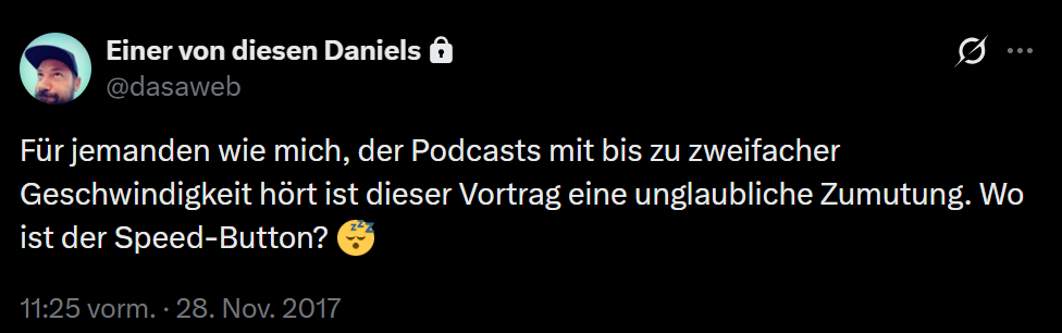 Zu dem Thema schnelleres Podcast-Hören (“Podfaster”) könnte ich jetzt so einiges schreiben, aber als Podcast- und Radio-Fan empfehle ich euch lieber diesen kleinen Radiobeitrag auf Deutschlandfunk Nova von Thomas Reintjes (@tomtjes), zu dem er mich aufgrund des oben zitierten Tweets kurz interviewt hat: