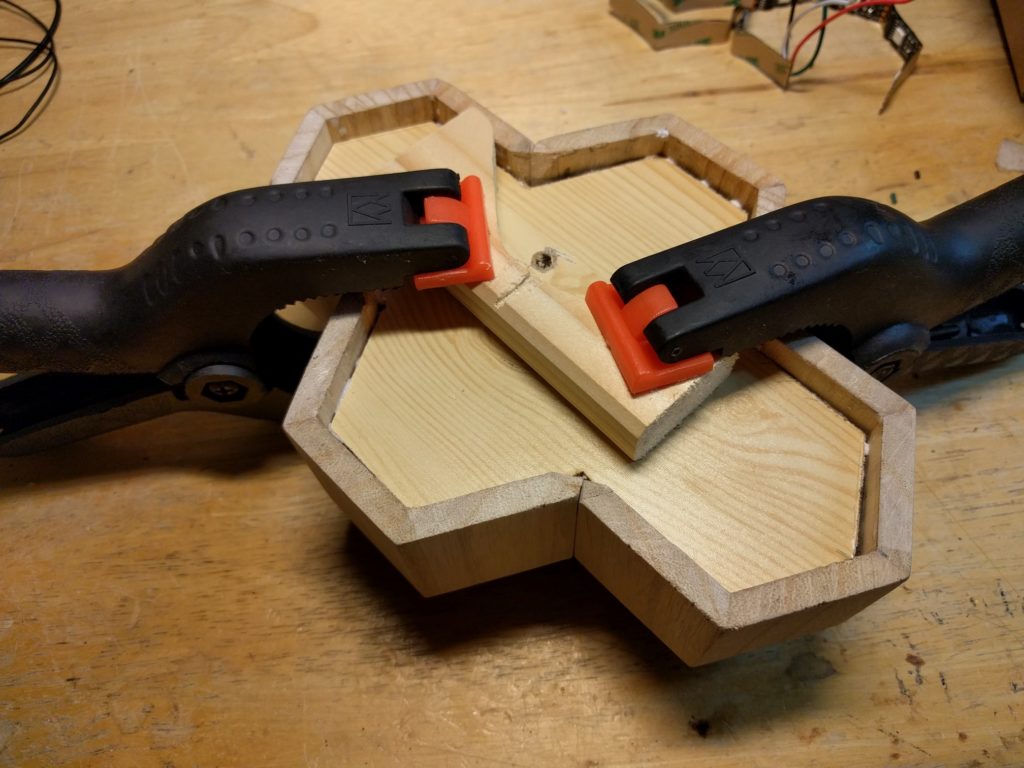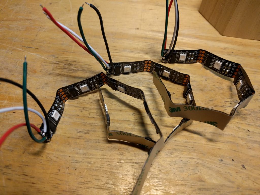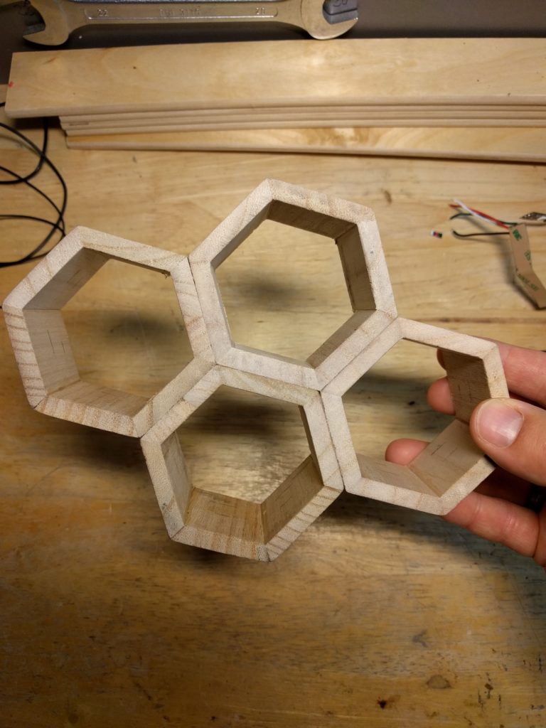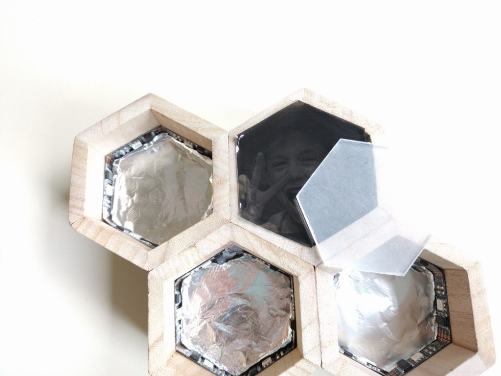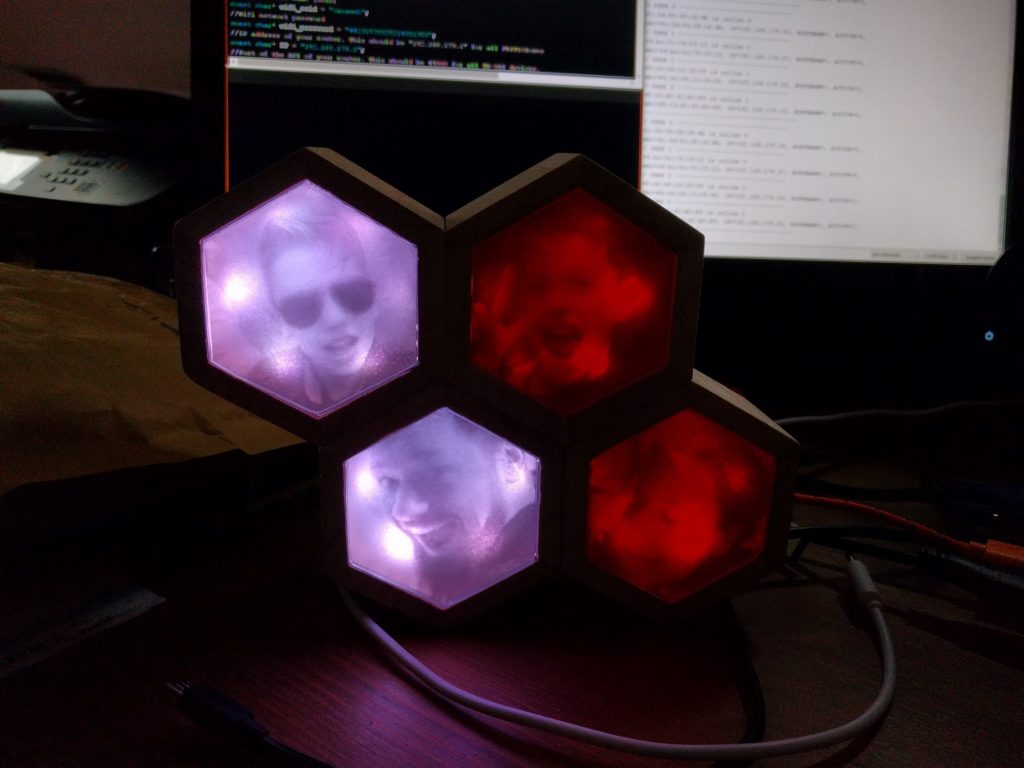 Als ersten Schritt hatte ich als “proof of concept” wiedermal einen Wemos D1 mini zur Hand genommen, 4 LEDs angeschlossen (für jedes Familienmitglied eine), ein Programm geschrieben und das Teil im Haus testweise einige Tage laufen lassen. LED an = Person ist zuhause, LED aus = Person ist nicht zuhause. Das hat nach einem groben Fehlschlag doch recht zügig funktioniert, Details zur Programmierung gitb es weiter unten. Ich wollte das Ganze aber etwas schöner gestalten, sollte eher ein dekoratives Element werden. Einige Entwürfe wurden gezeichnet, am Ende habe ich mich für das oben gezeigte hexagonale Layout entschieden. Ausgangsmaterial waren zwei Stiftehalter aus Holz. Die wurden jeweils halbiert, der Boden abgetrennt, das ganze verleimt. Innen habe ich einzeln adressierbare LED-Strips verbaut, und am Ende die Waben vorne mit milchig geschliffene Plexiglasscheiben vor schwarzweiß gedruckten Fotos abgeschlossen.