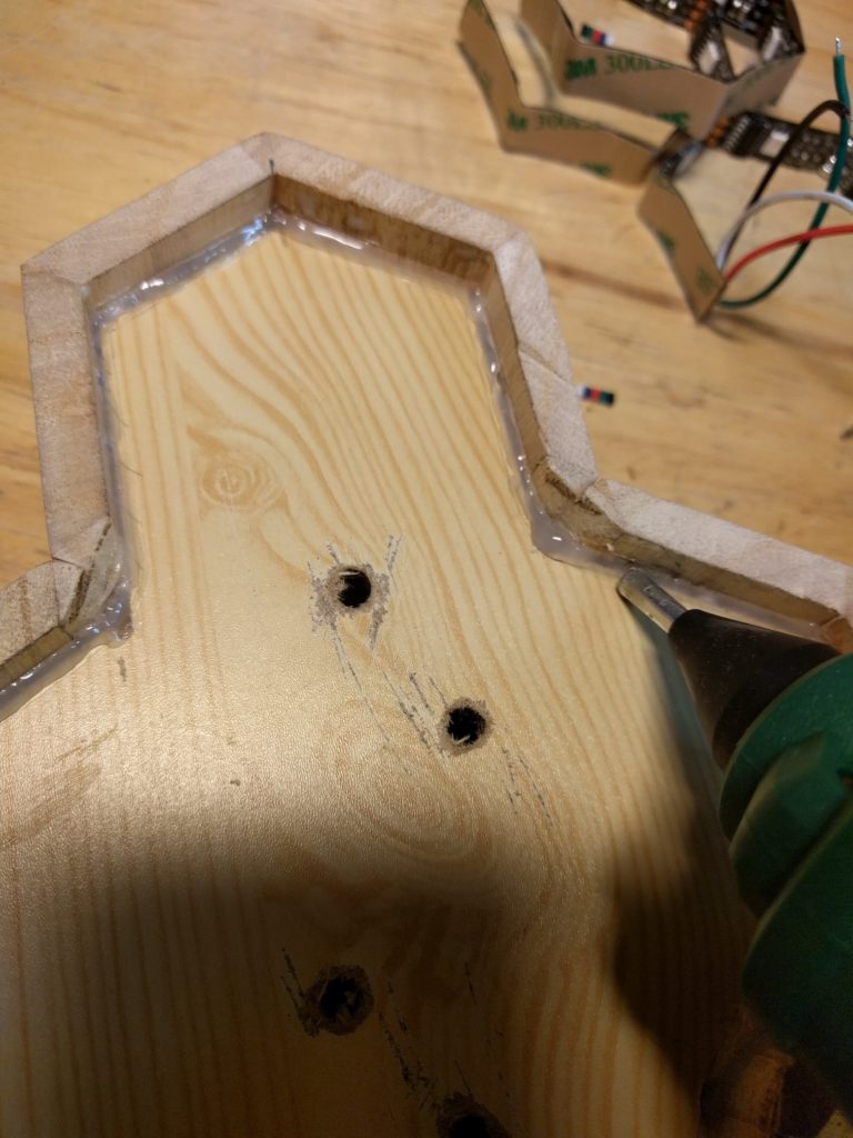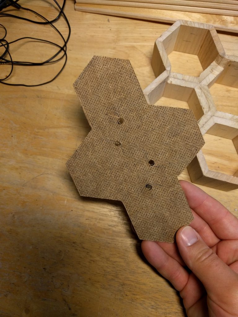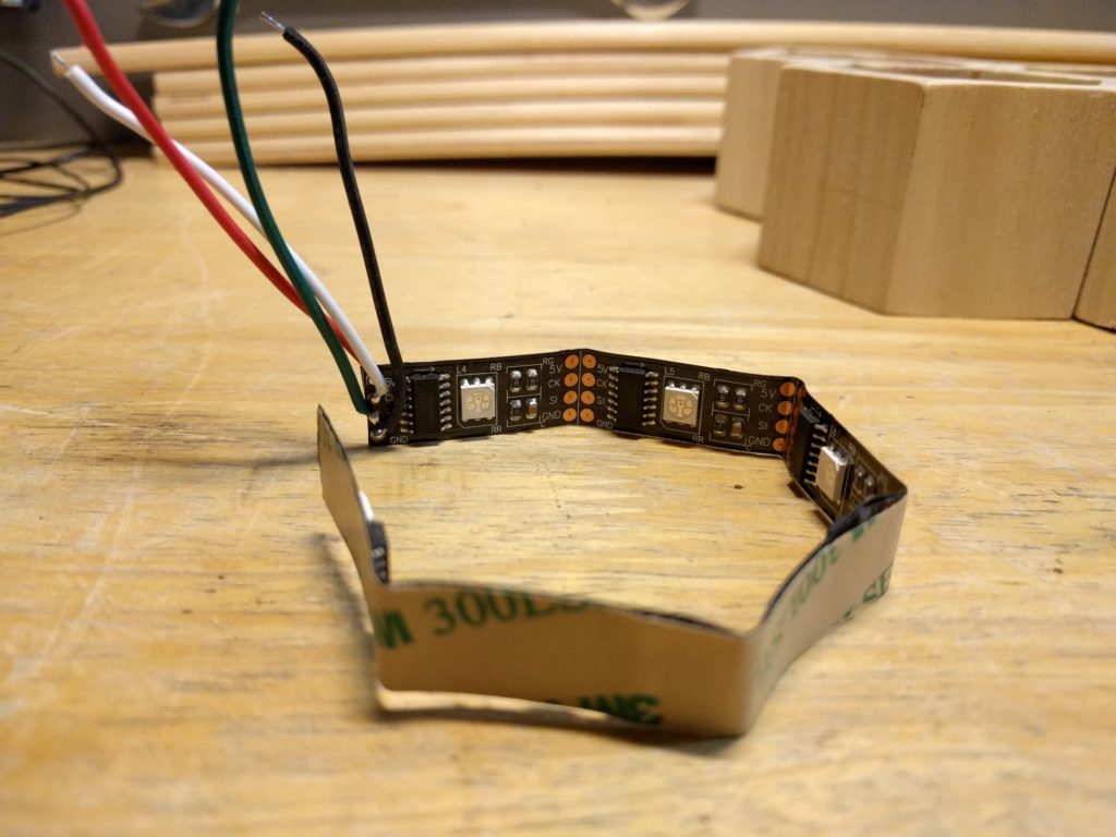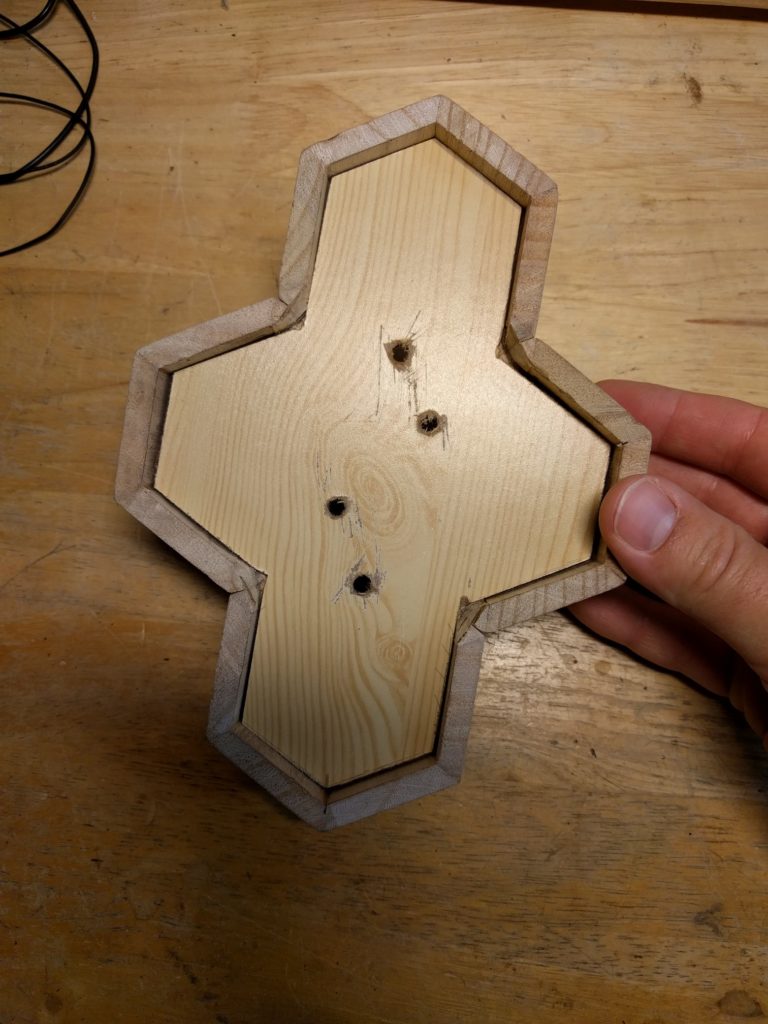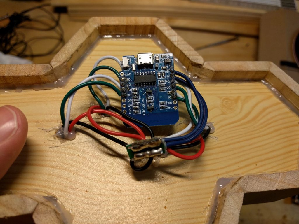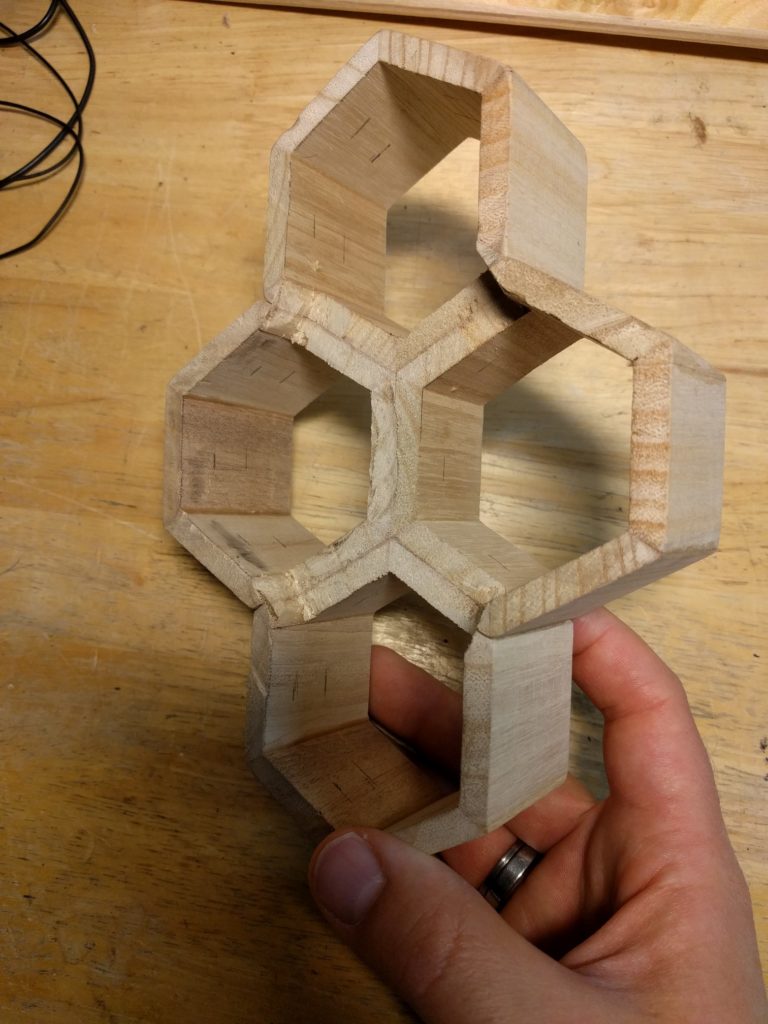 Als ersten Schritt hatte ich als “proof of concept” wiedermal einen Wemos D1 mini zur Hand genommen, 4 LEDs angeschlossen (für jedes Familienmitglied eine), ein Programm geschrieben und das Teil im Haus testweise einige Tage laufen lassen. LED an = Person ist zuhause, LED aus = Person ist nicht zuhause. Das hat nach einem groben Fehlschlag doch recht zügig funktioniert, Details zur Programmierung gitb es weiter unten. Ich wollte das Ganze aber etwas schöner gestalten, sollte eher ein dekoratives Element werden. Einige Entwürfe wurden gezeichnet, am Ende habe ich mich für das oben gezeigte hexagonale Layout entschieden. Ausgangsmaterial waren zwei Stiftehalter aus Holz. Die wurden jeweils halbiert, der Boden abgetrennt, das ganze verleimt. Innen habe ich einzeln adressierbare LED-Strips verbaut, und am Ende die Waben vorne mit milchig geschliffene Plexiglasscheiben vor schwarzweiß gedruckten Fotos abgeschlossen.