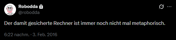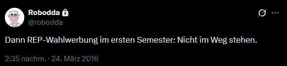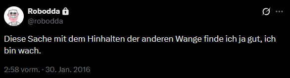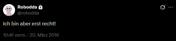Ich muss etwas erklären, und eigentlich ist es dafür schon fast zu spät. Am 27. Januar 2016 habe ich ein kleines Wesen in die Welt gesetzt, welches seither mein Leben bereichert. Die Rede ist von @robodda, meinen Twitter-Roboter. Dieses Dings hat schon für einige Verwirrung gesorgt, daher ist es allerhöchste Eisenbahn, etwas Klarheit zu schaffen. Das Wichtigste, was zu sagen ist: Ich bin @dasaweb und nicht @robodda! Ich schreibe nicht persönlich unter diesem @robodda-Account. Gut, verwand ist der Kleine schon mit mir, so ähnlich wie Kinder mit einem verwand sind. Aber ein Kind ist er auch nicht, er ist einfach nur ein Roboter. Präzise müsste man sagen ein “Bot”, was Wikipedia folgendermaßen definiert: